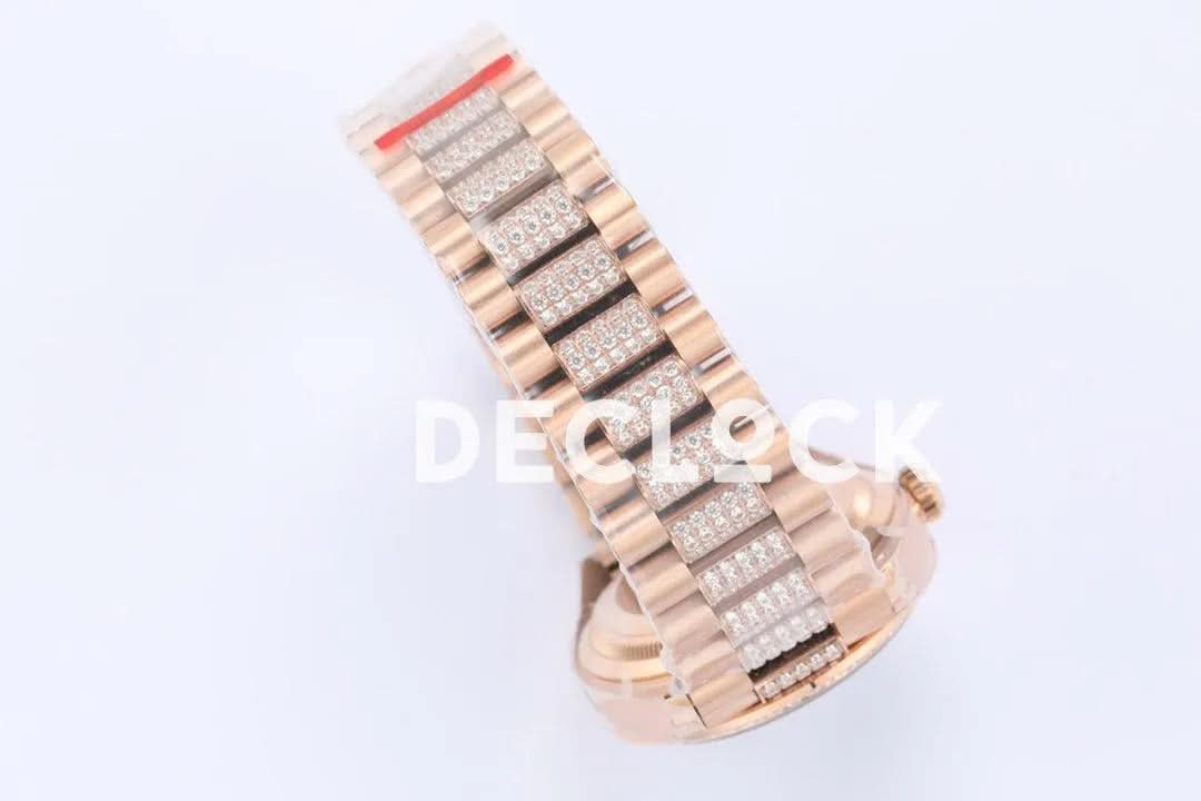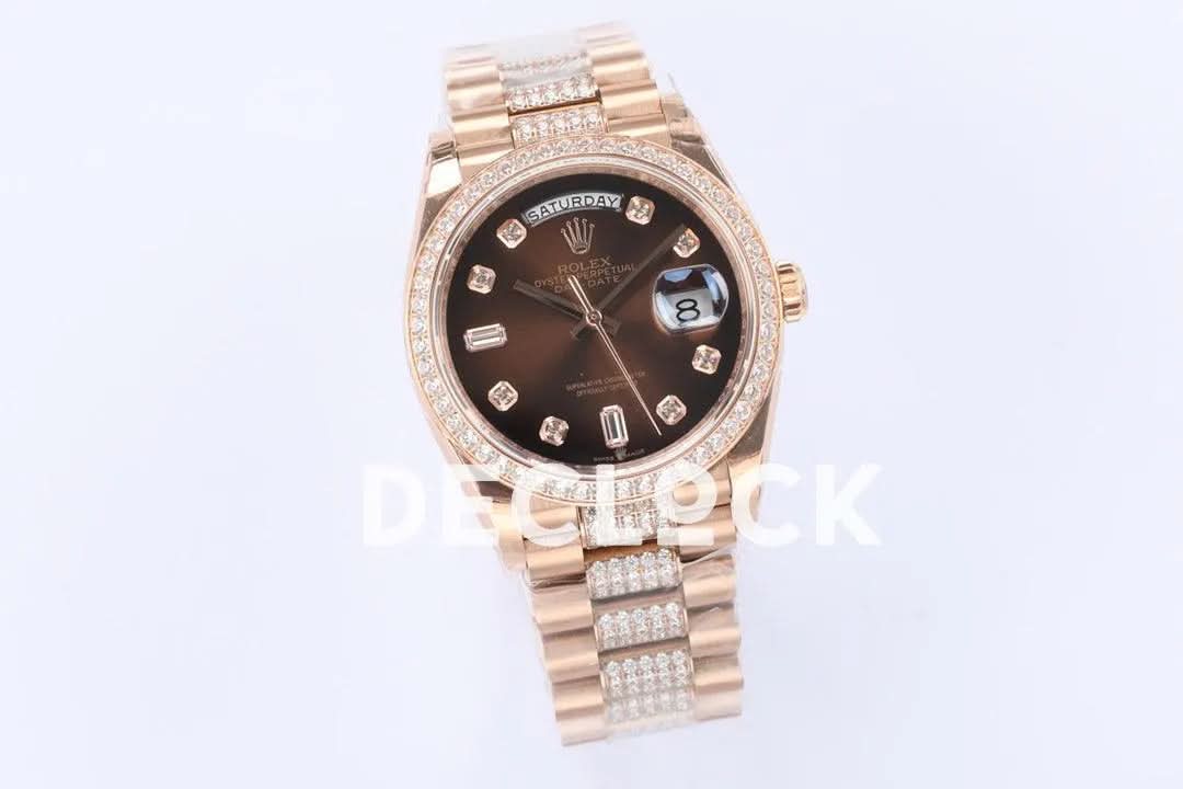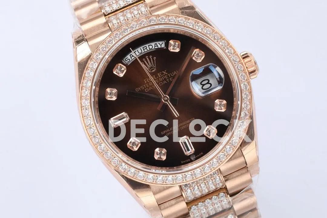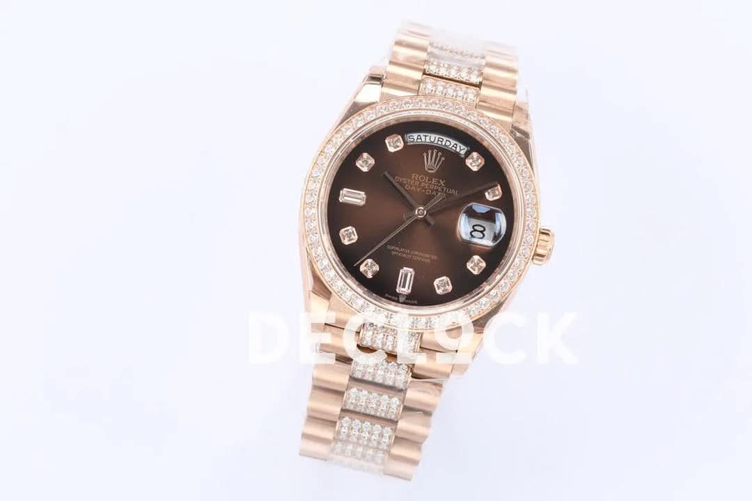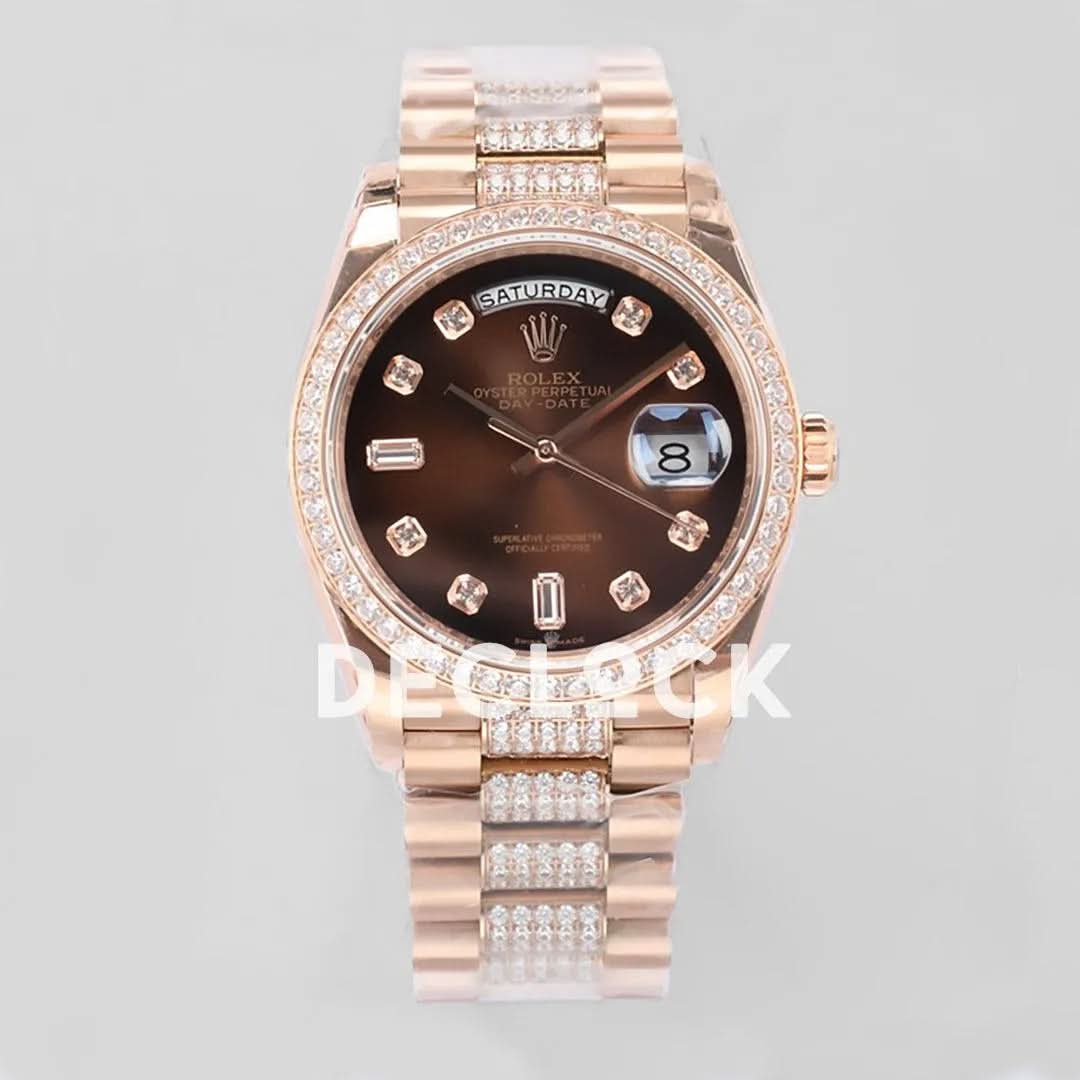 Replica Rolex Day-Date 36 128345RBR Brown Dial with Diamond Bezel in Everose Gold