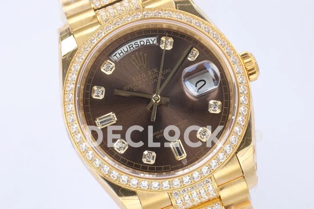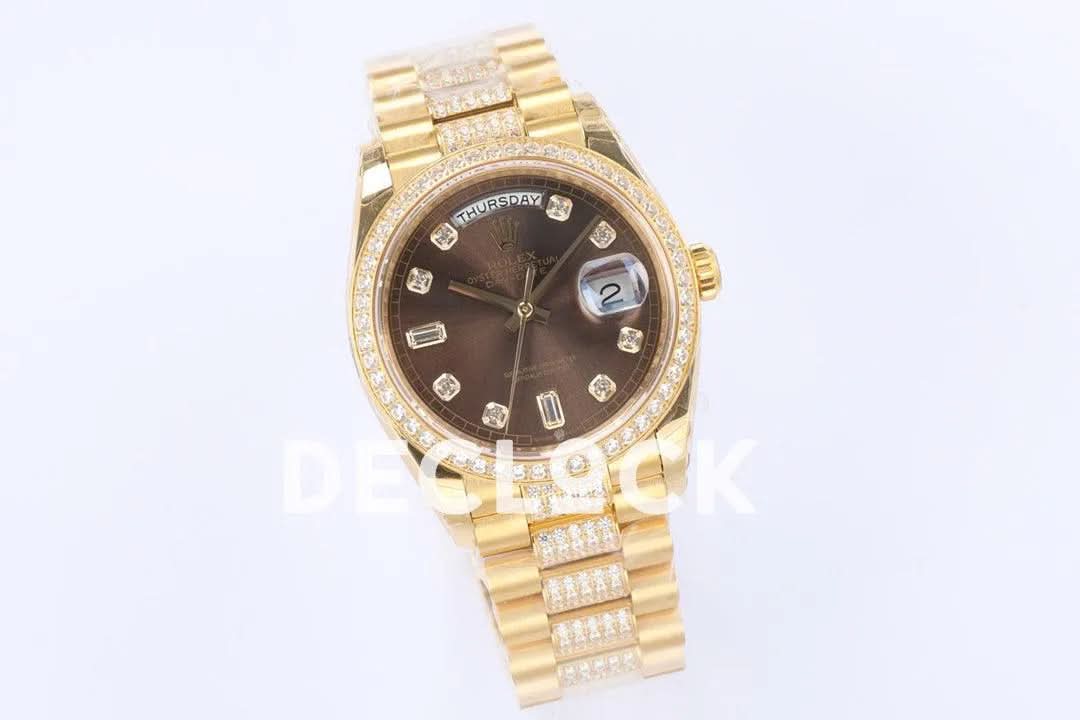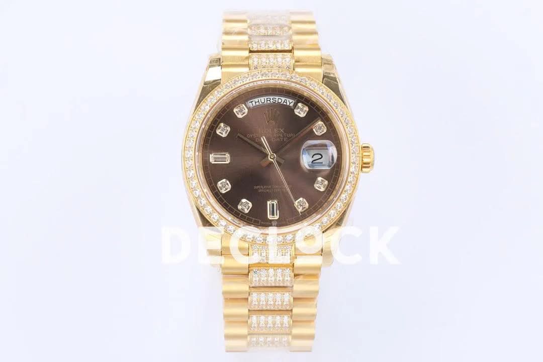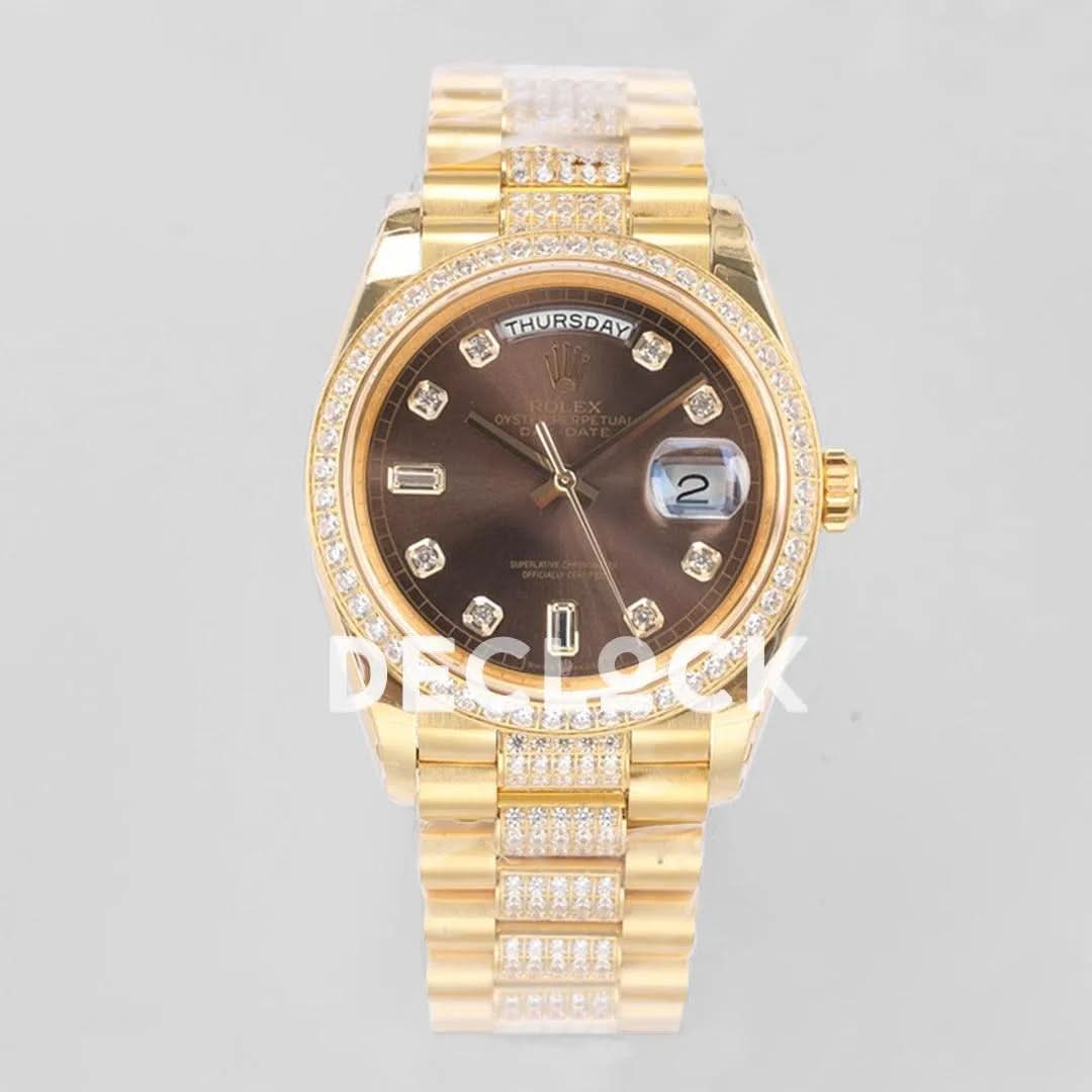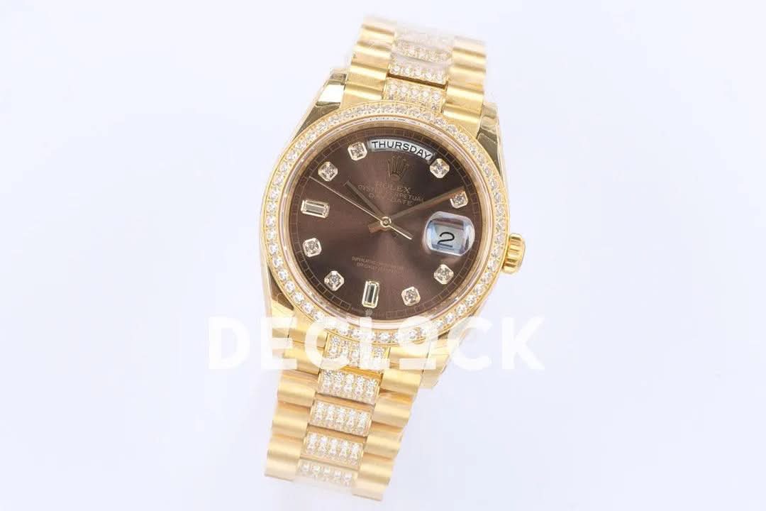 Replica Rolex Day-Date 36 128348RBR Brown Dial with Diamond Bezel in Yellow Gold