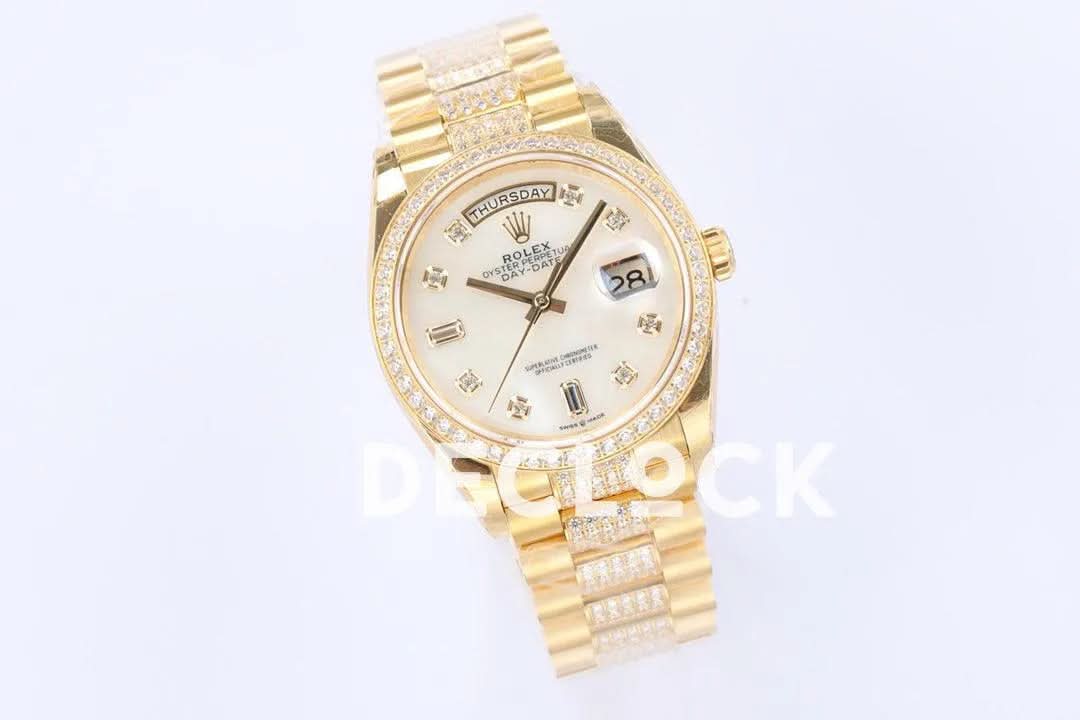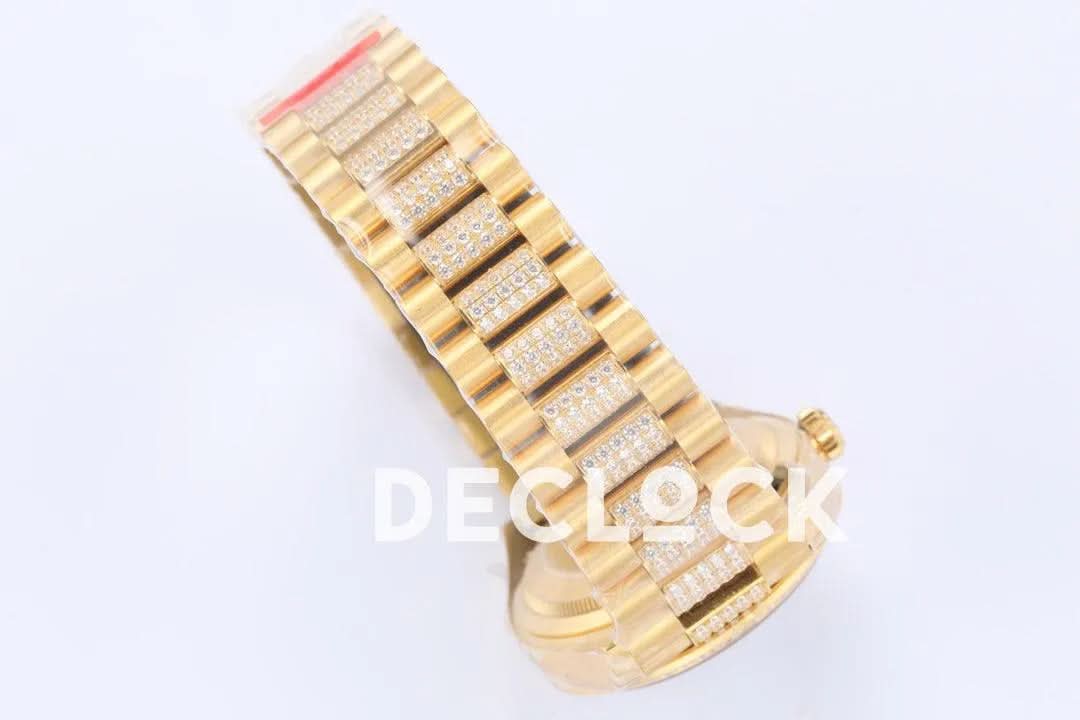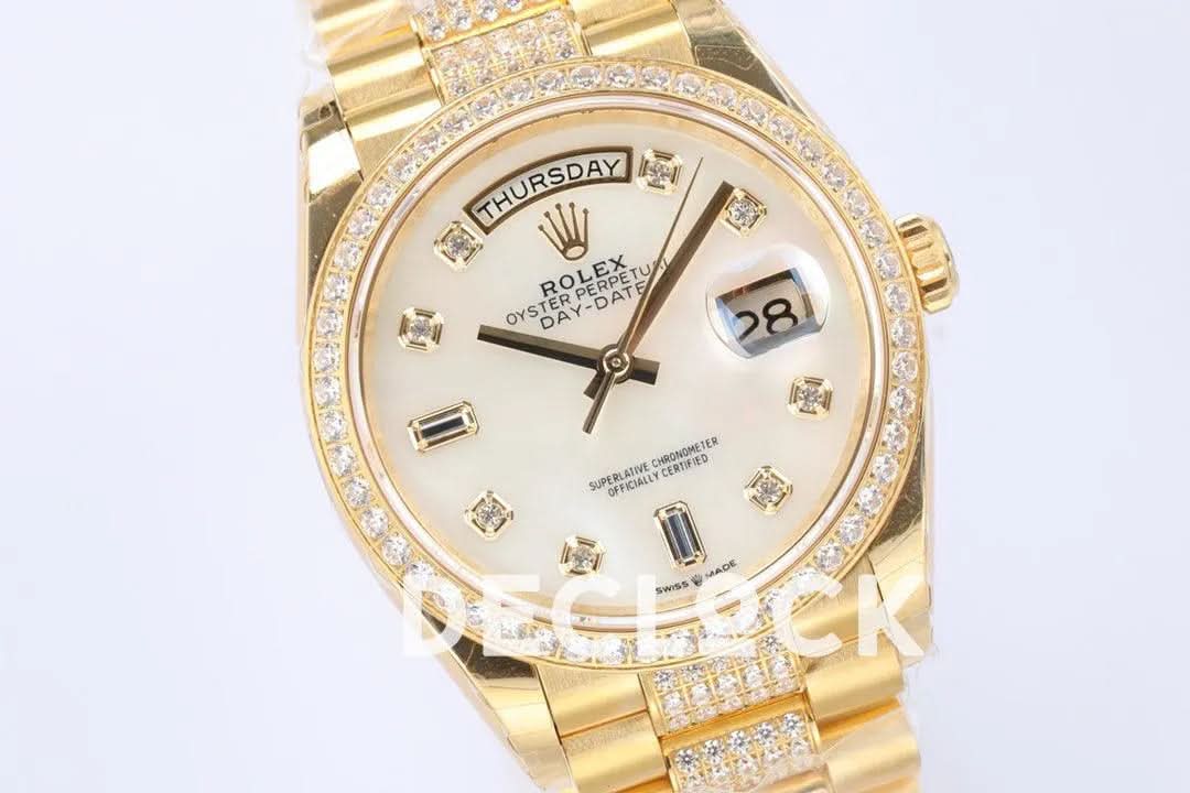 Replica Rolex Day-Date 36 128348RBR MOP Dial with Diamond Bezel in Yellow Gold