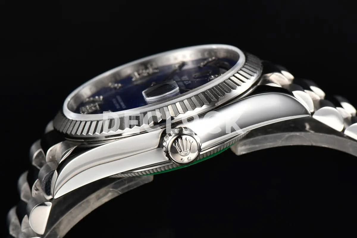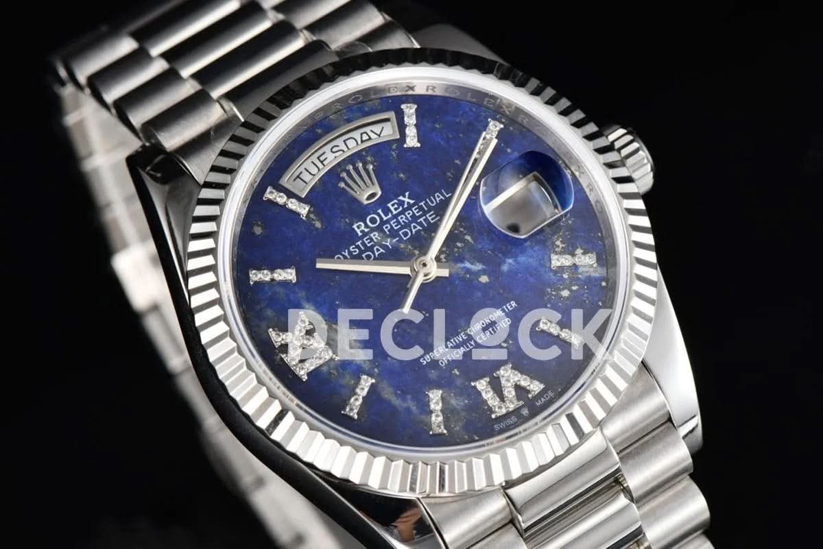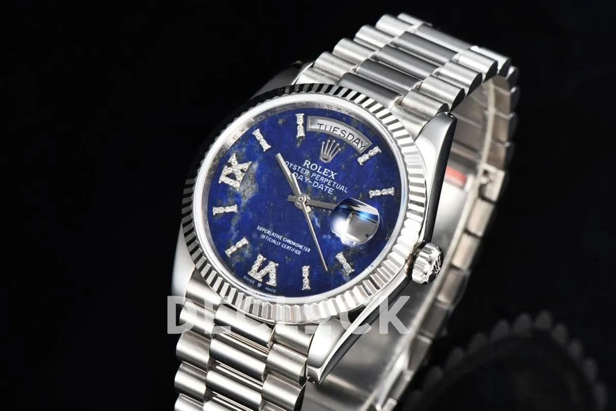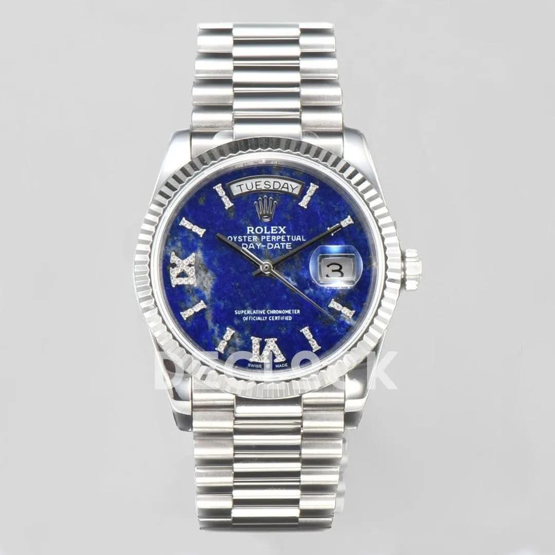 Replica Rolex Day-Date 36 128236 Lapis Lazuli Diamond Roman Dial in Platinum