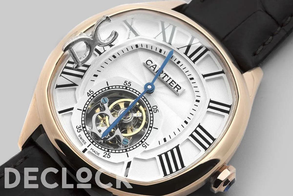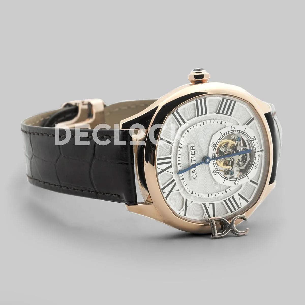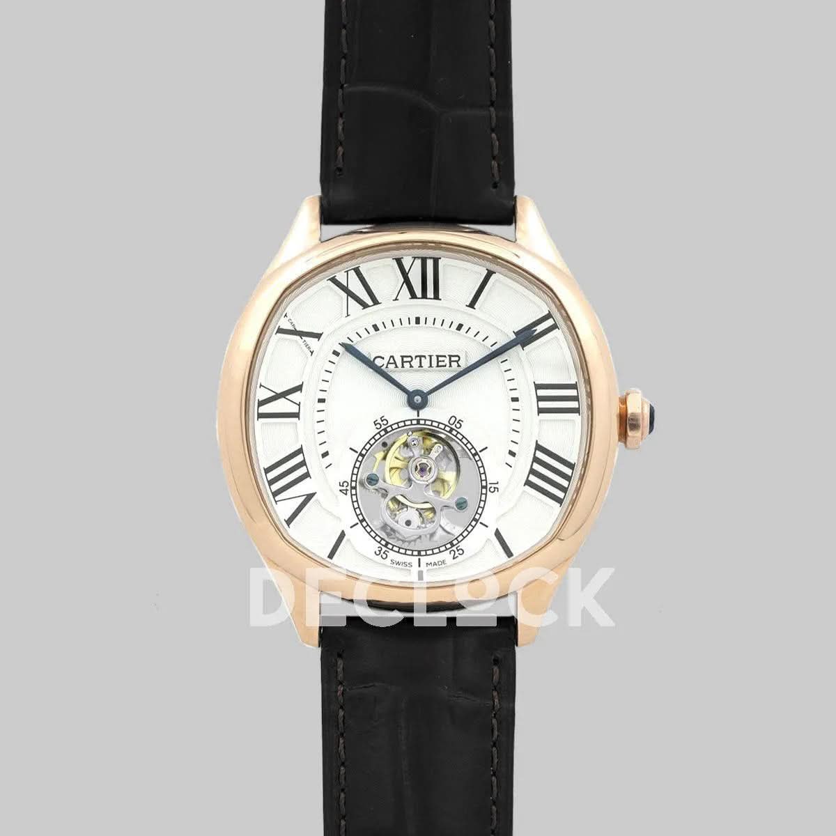 Replica Cartier Drive de Cartier Tourbillon White Dial in Rose Gold on Black Leather Strap