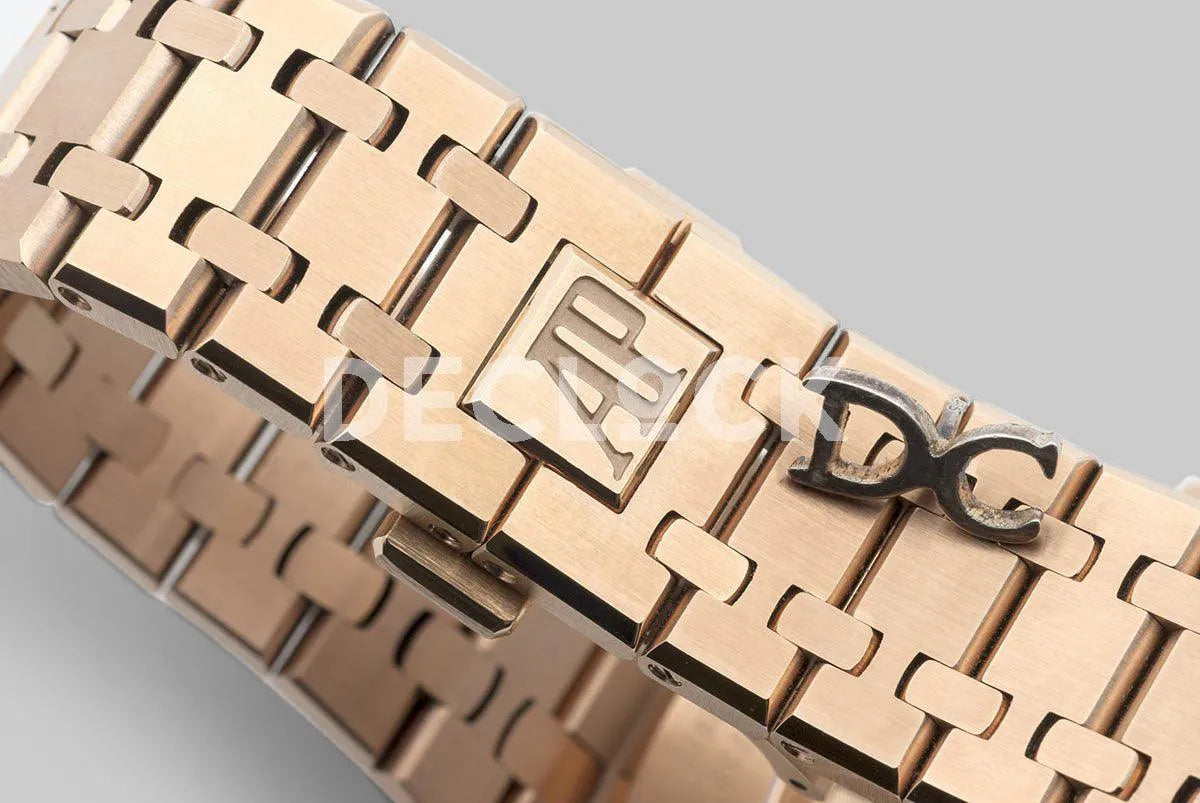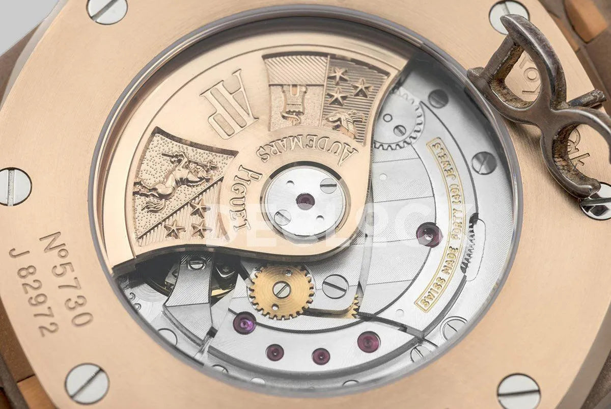 Κάσα | 18k Rose Gold σε ανοξείδωτο ατσάλι 316L, επιπλατινωμένη πλάκα κίνησης (open back) και ρότορας που κατασκευάζονται σύμφωνα με την αυθεντική κίνηση, τον πιο όμορφο AP Cliber 3120 |