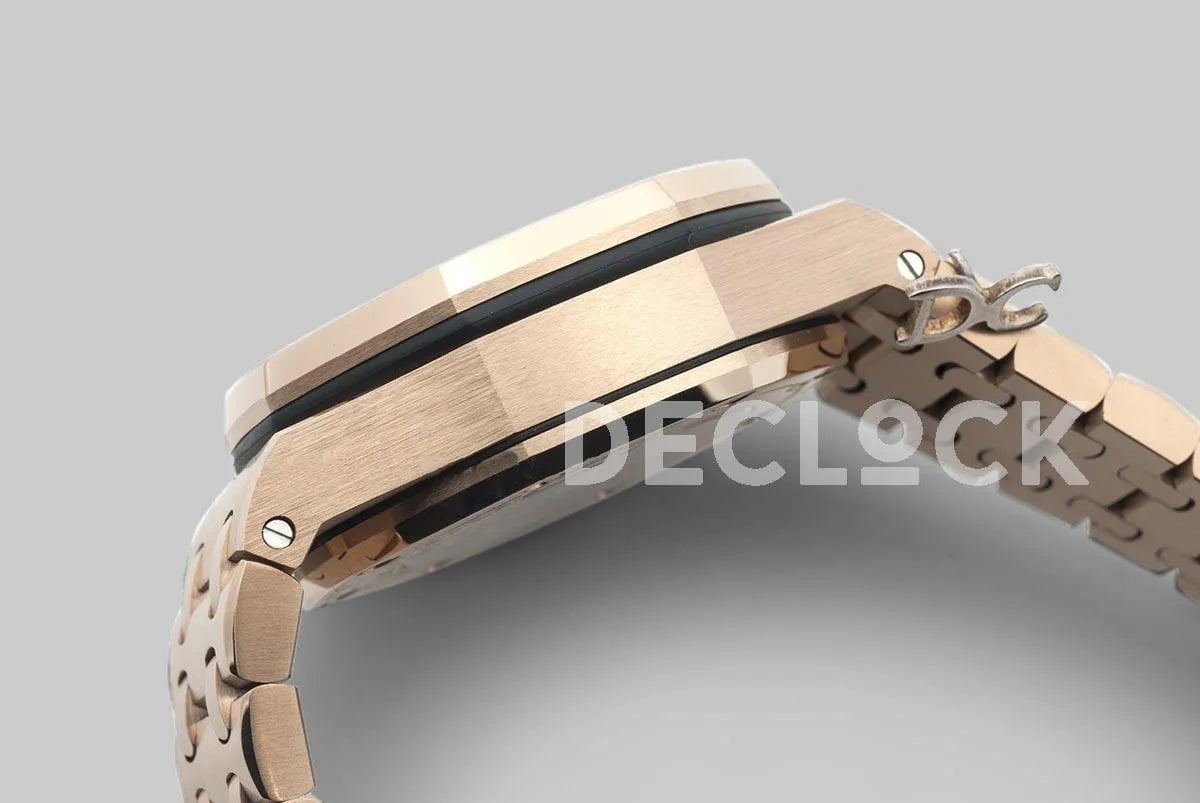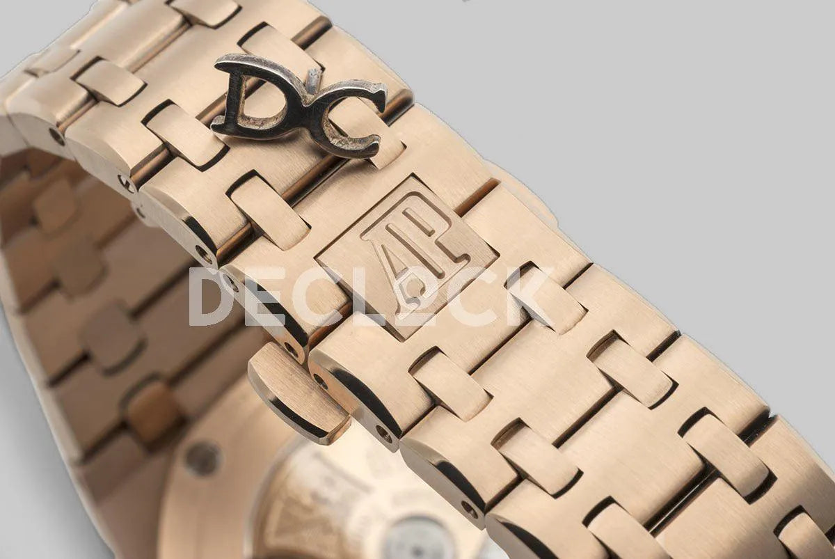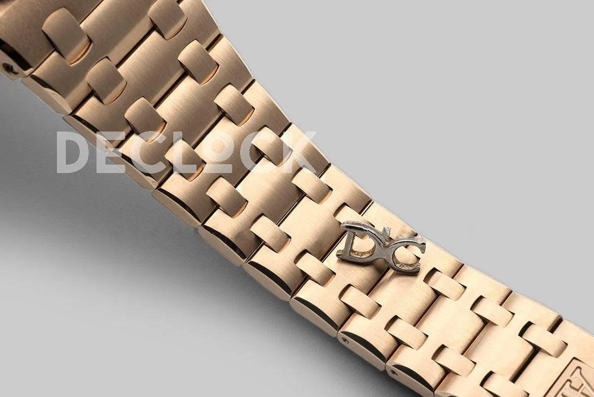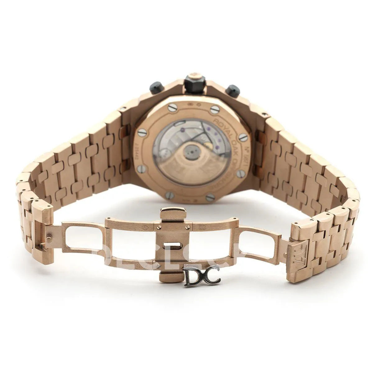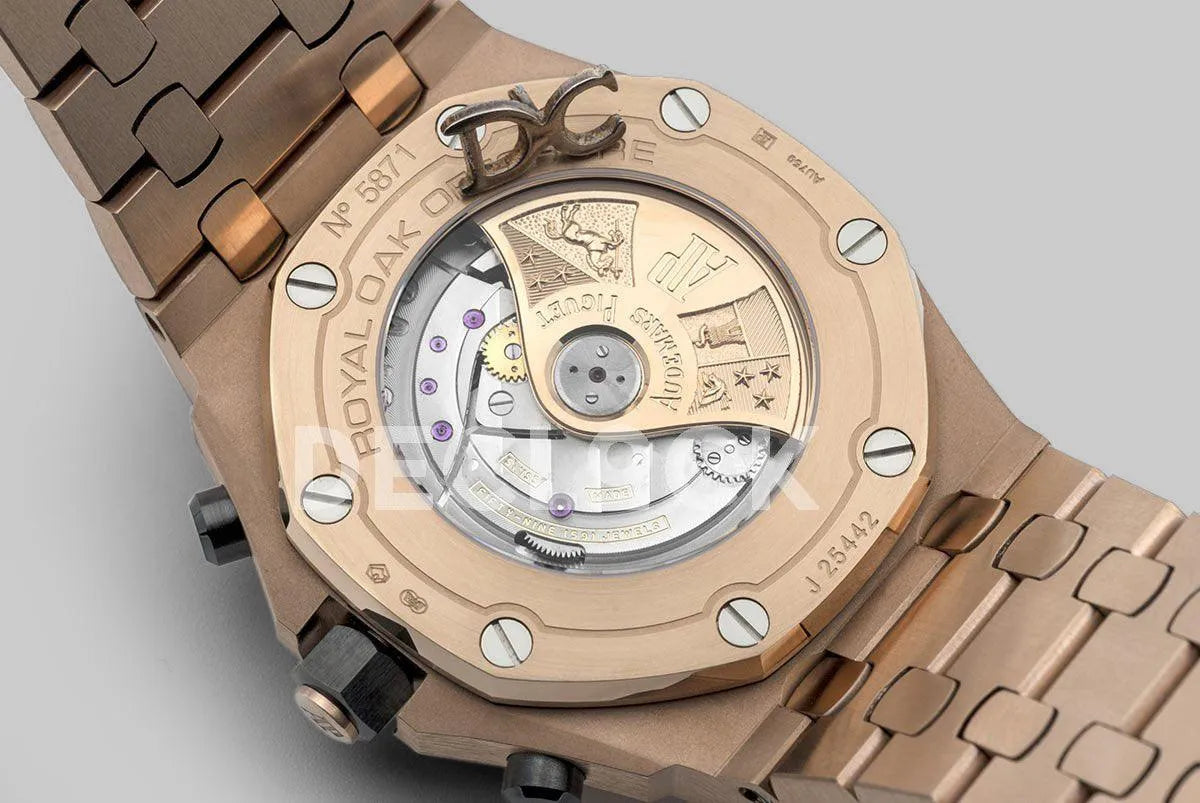 Κάσα 316F 18k Rose Gold σε ανοξείδωτο ατσάλι, με επιπλατινωμένη πλάκα κίνησης (open back) και ρότορας που κατασκευάζονται σύμφωνα με την αυθεντική κίνηση, τον πιο όμορφο AP Cliber 3120