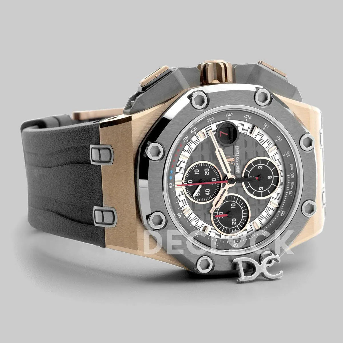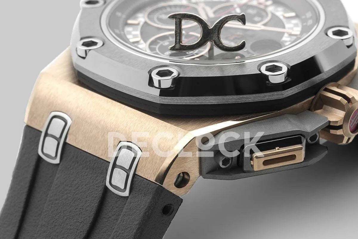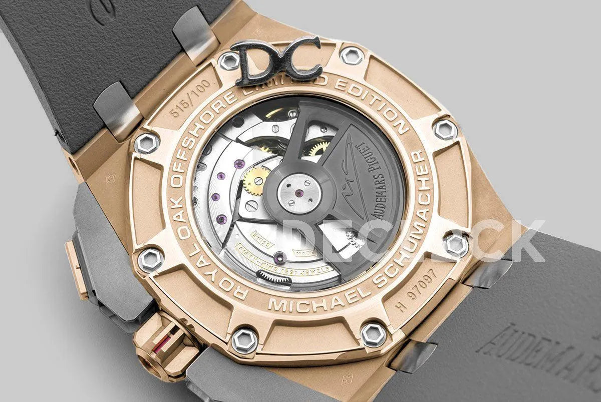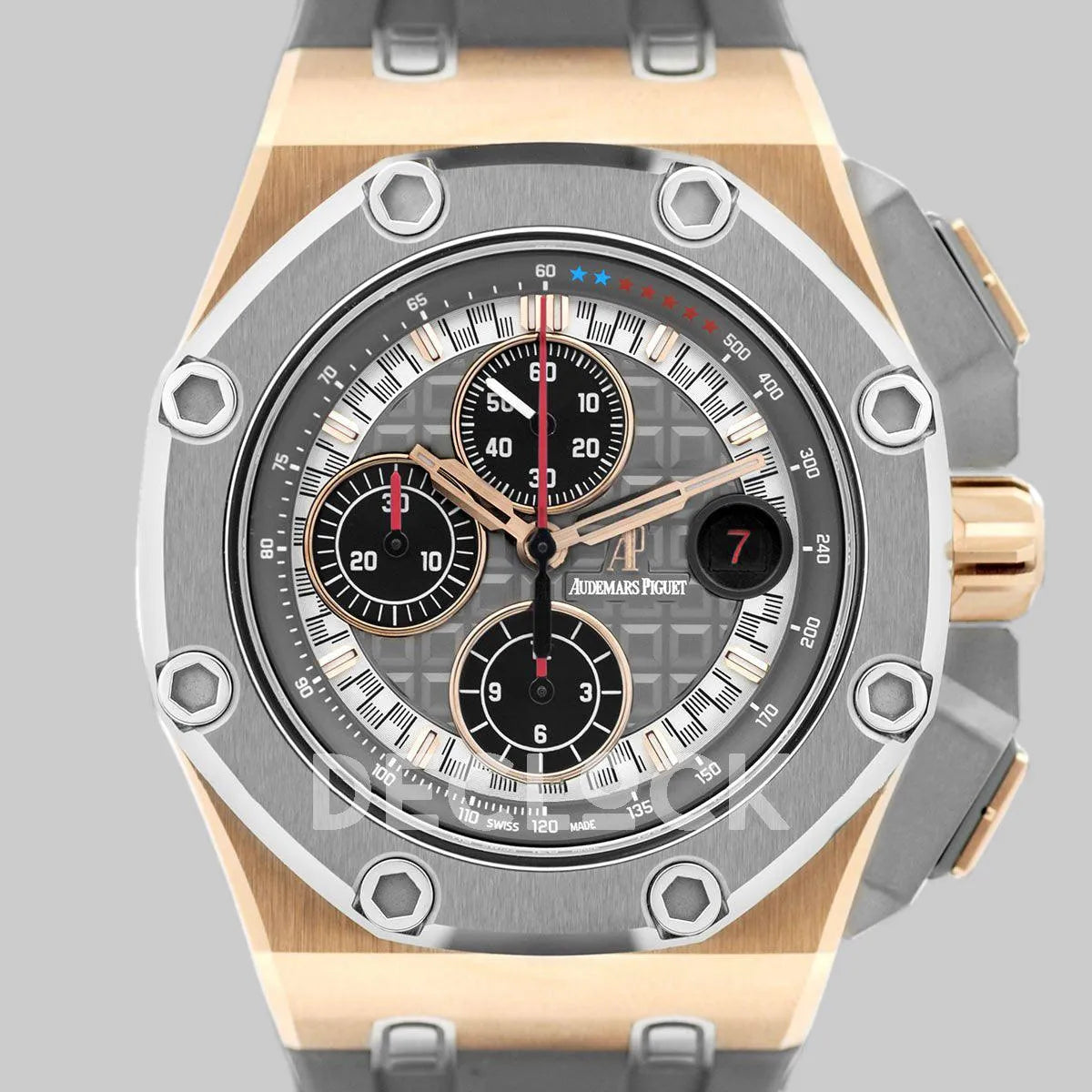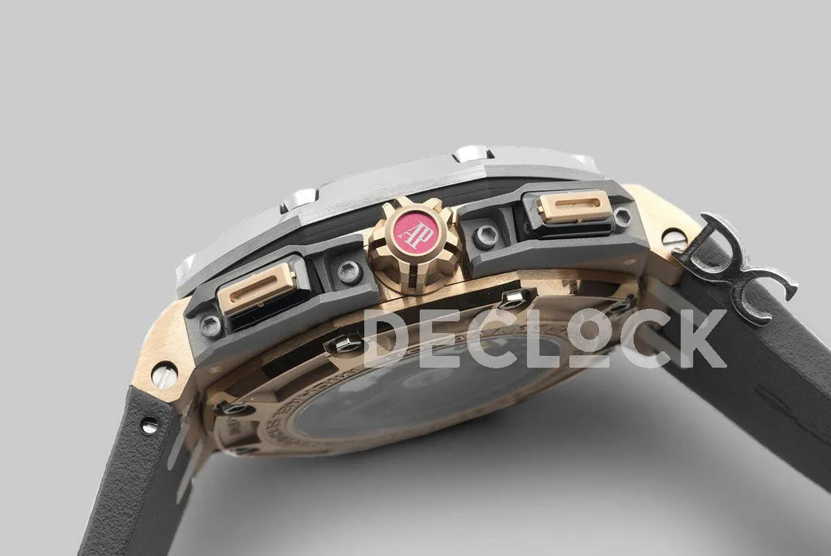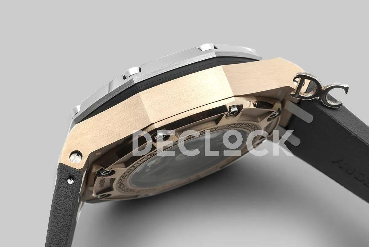Κάσα | 18k Rose Gold σε ανοξείδωτο ατσάλι, με επιπλατινωμένη πλάκα κίνησης (open back) και ρότορας που κατασκευάζονται σύμφωνα με την αυθεντική κίνηση, τον πιο όμορφο AP Cliber 3120 |