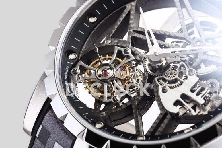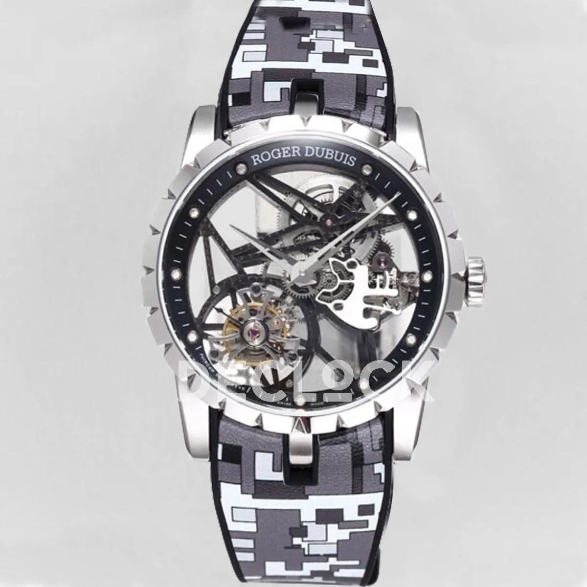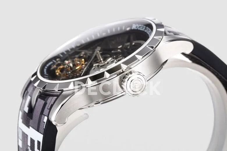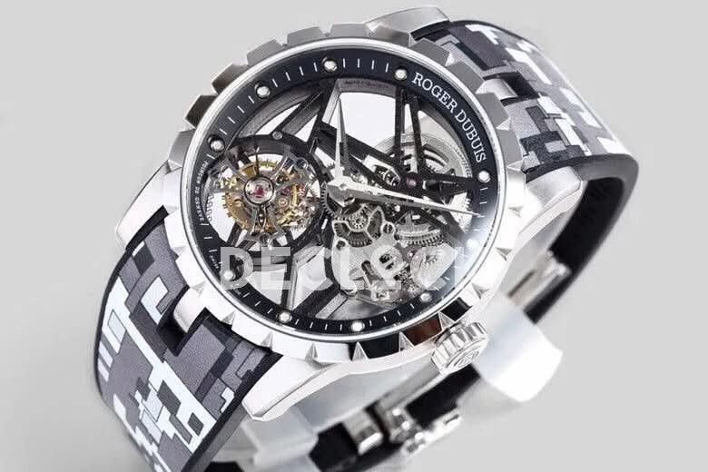 Replica Roger Dubuis Excalibur Spider Skeleton Flying Tourbillon in Steel with Gray/Black Rubber Strap