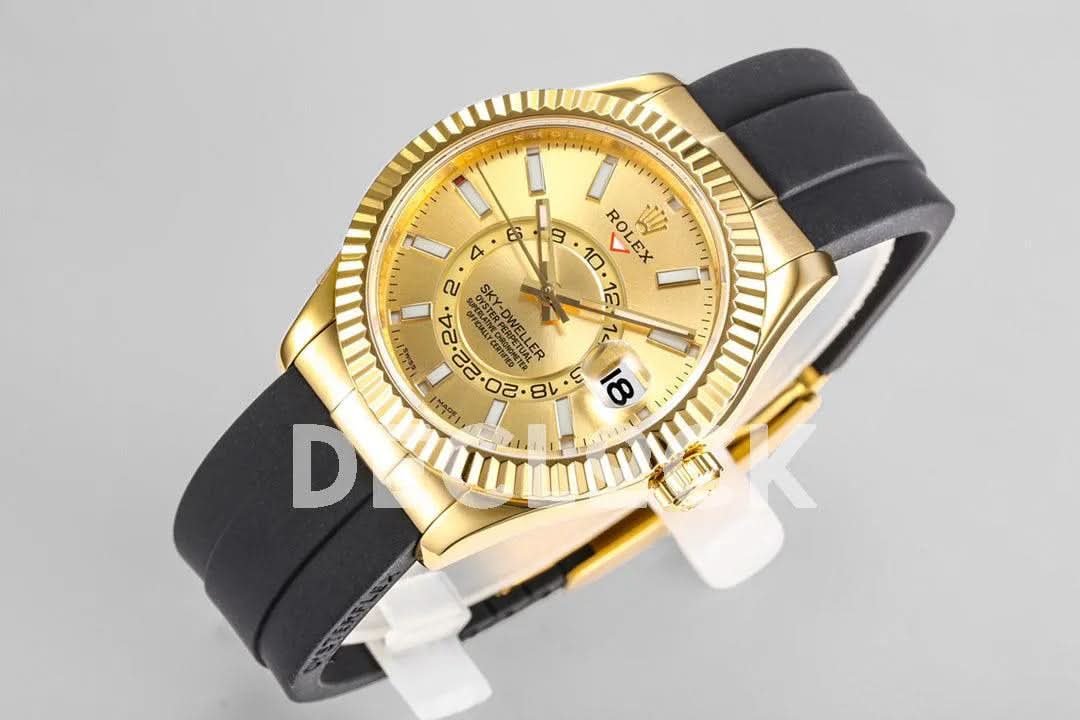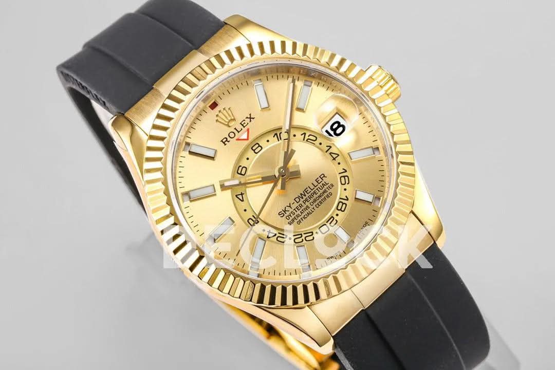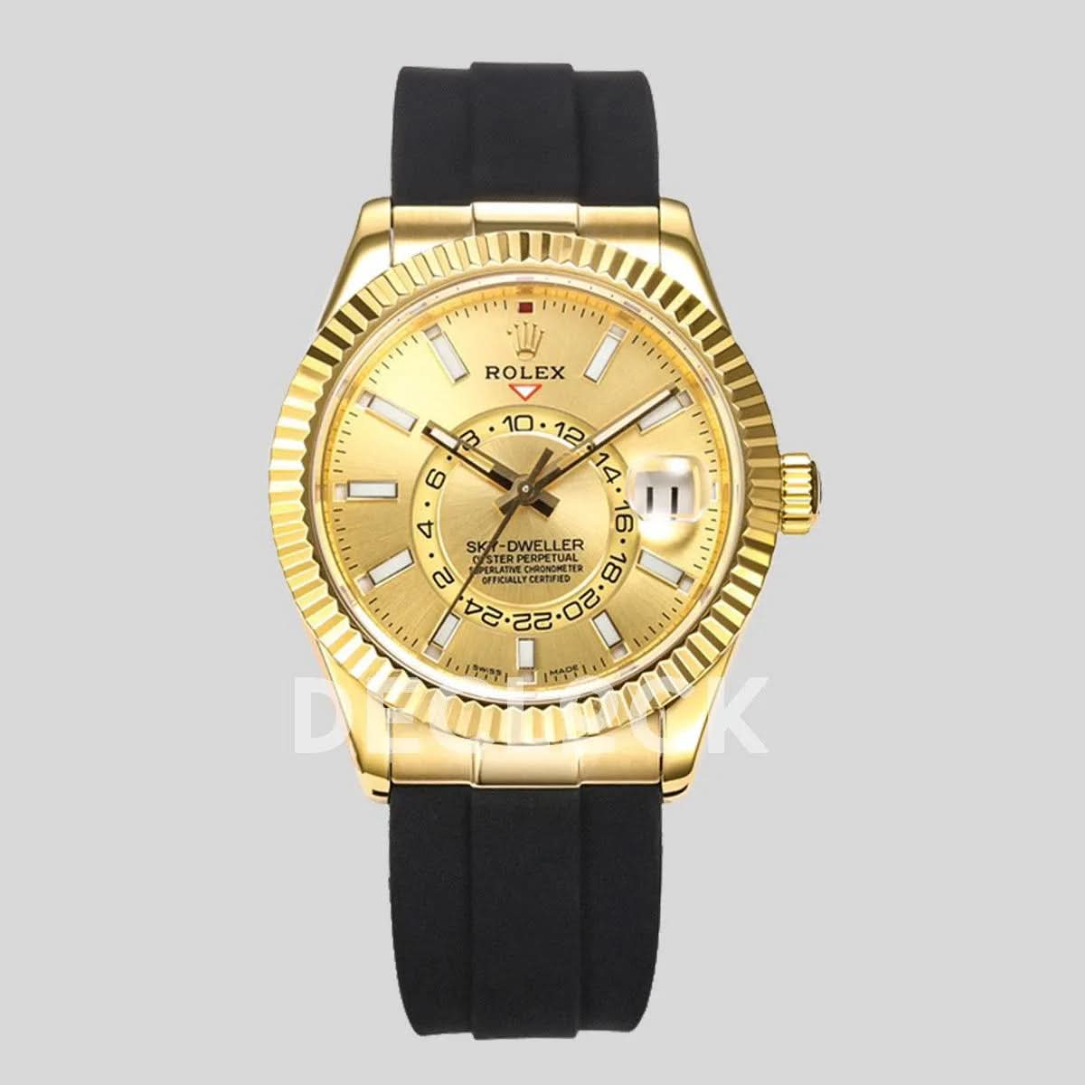 Replica Rolex Sky Dweller Yellow Gold in Gold Dial on Black Rubber Strap