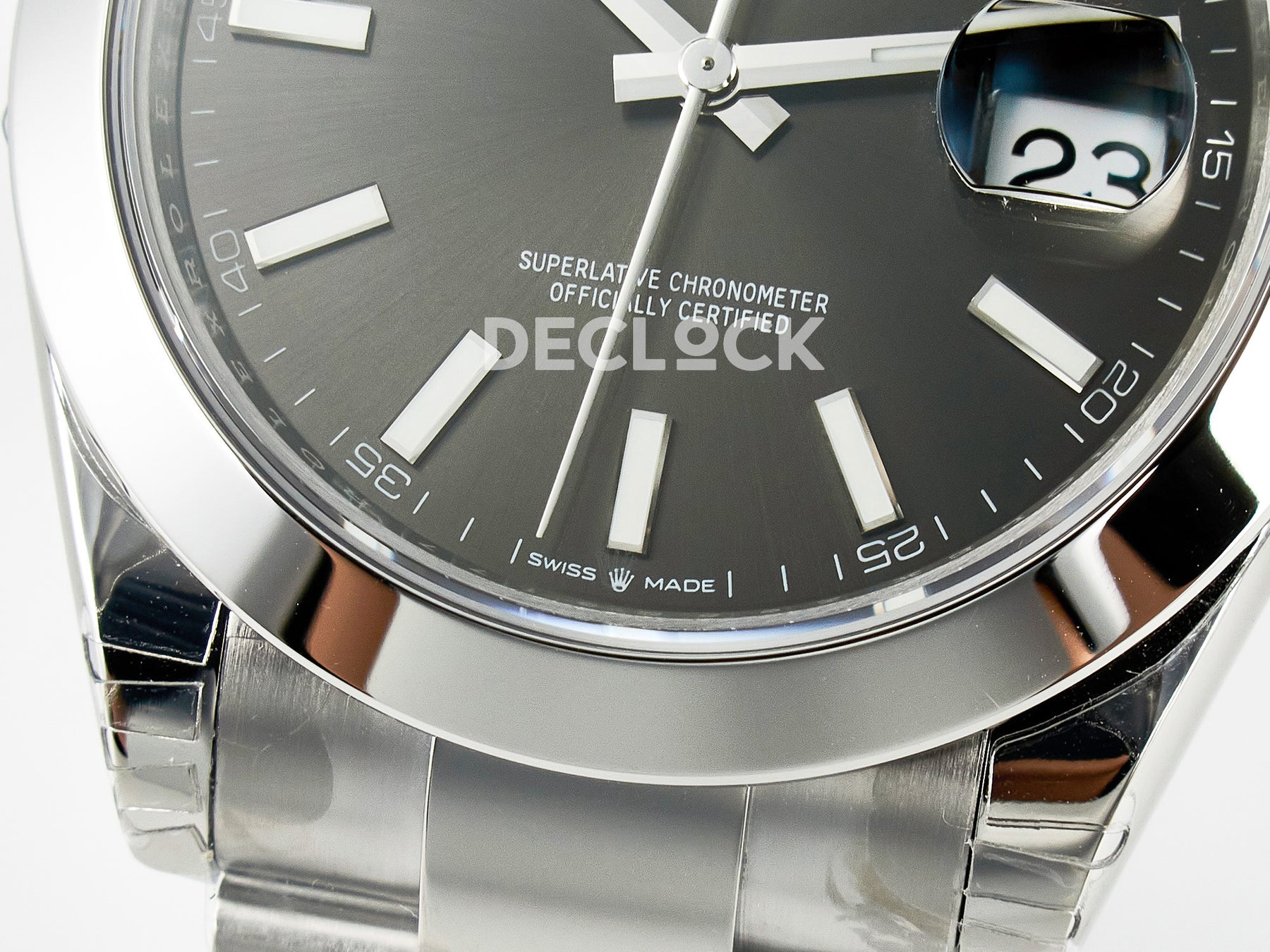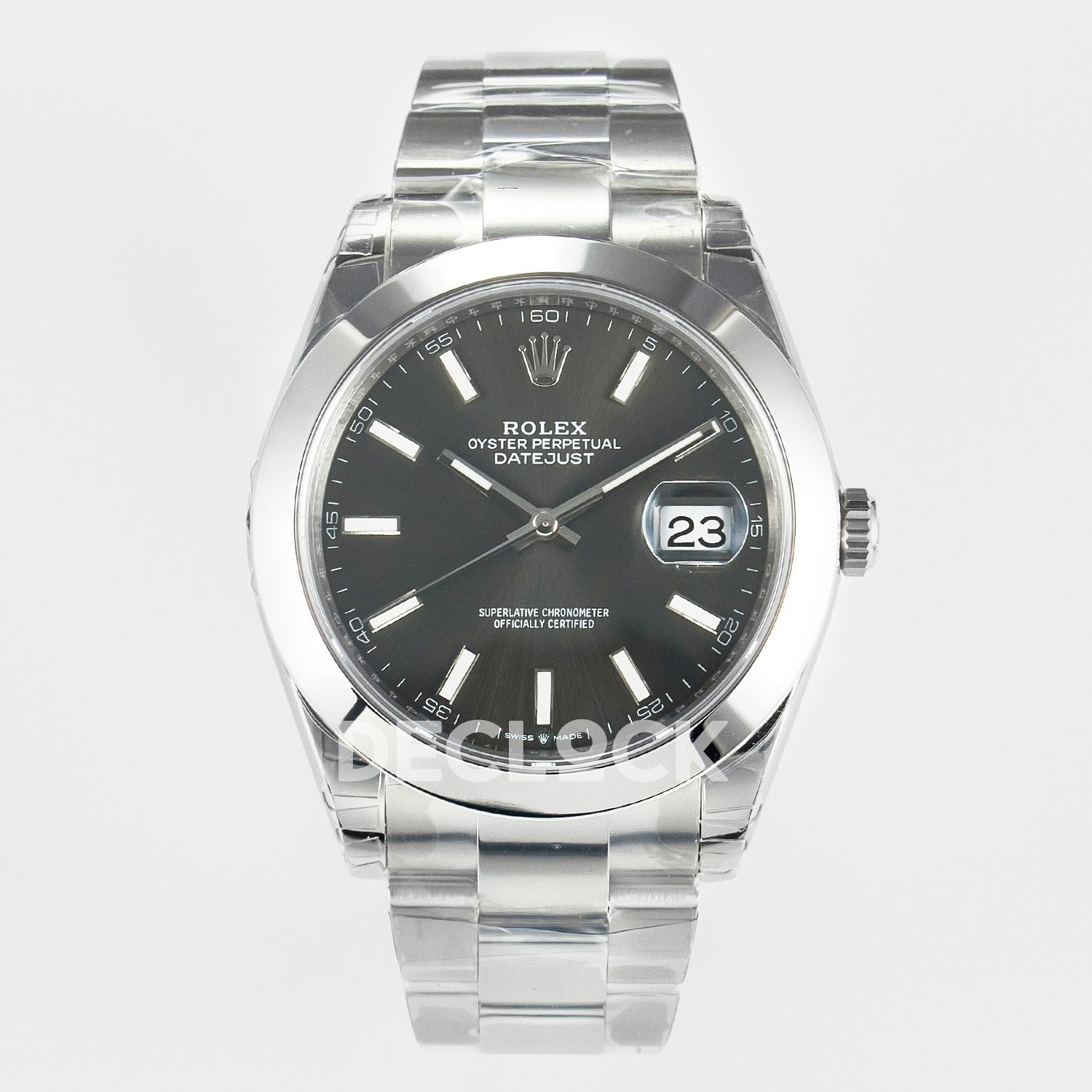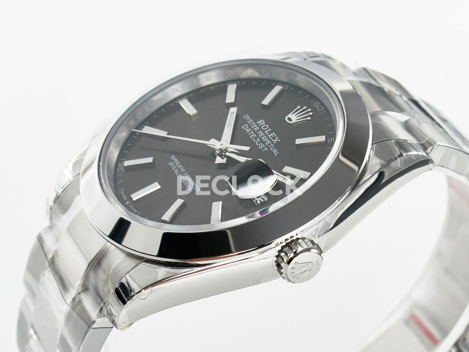 Crystal Anti-scratch sapphire crystal with semi-invisible crown engraved at 6 o'clock, cyclops magnifier (x2.5)