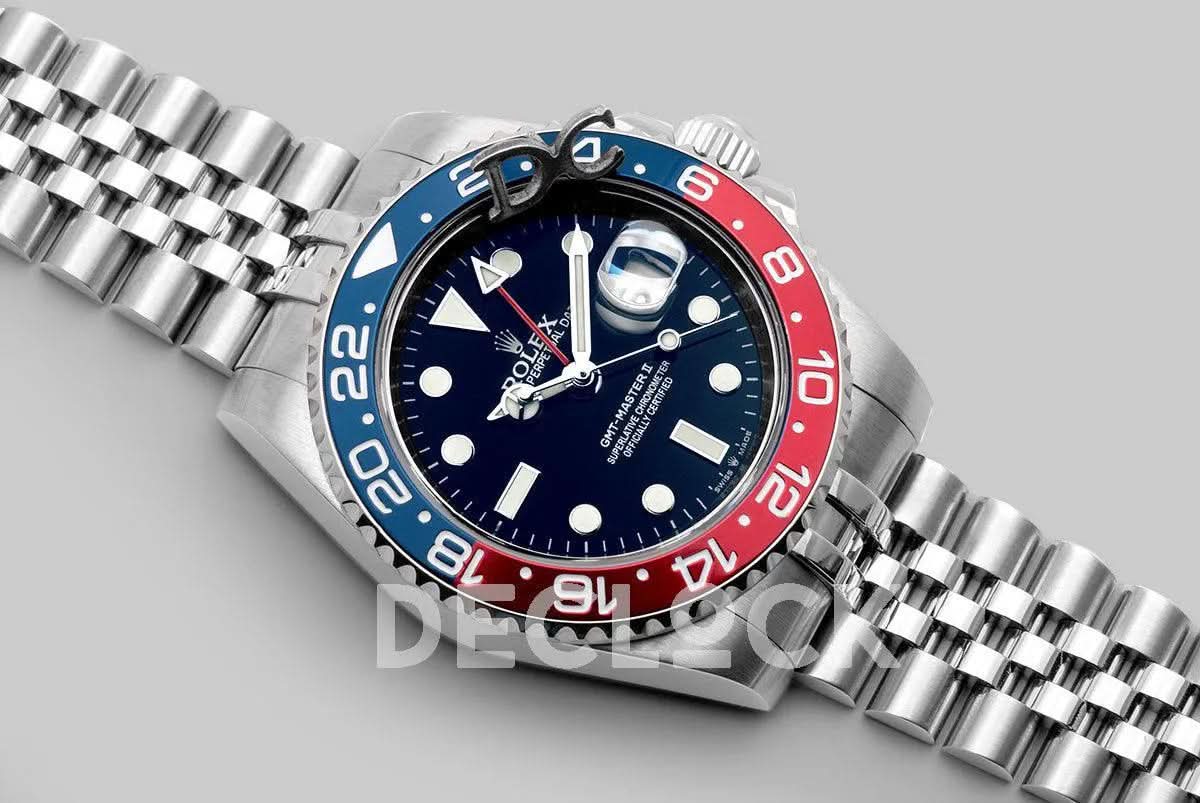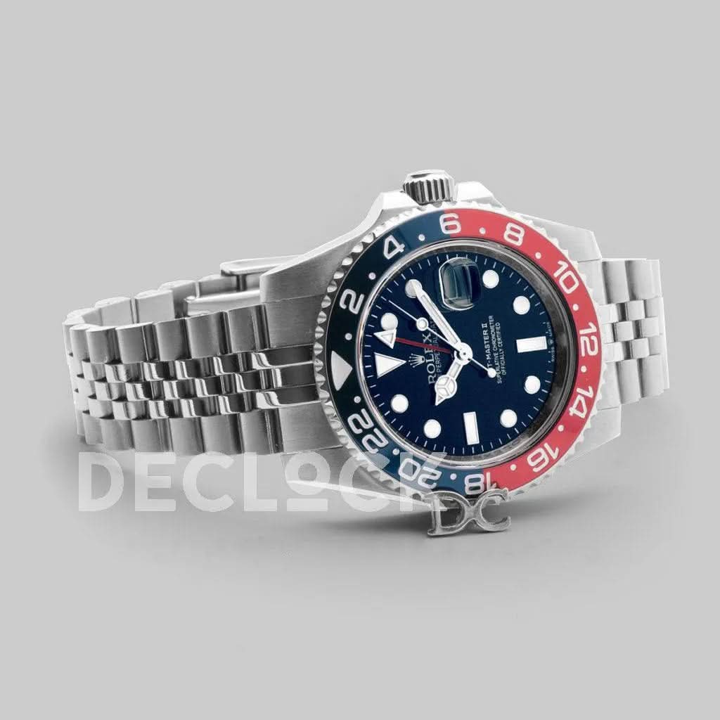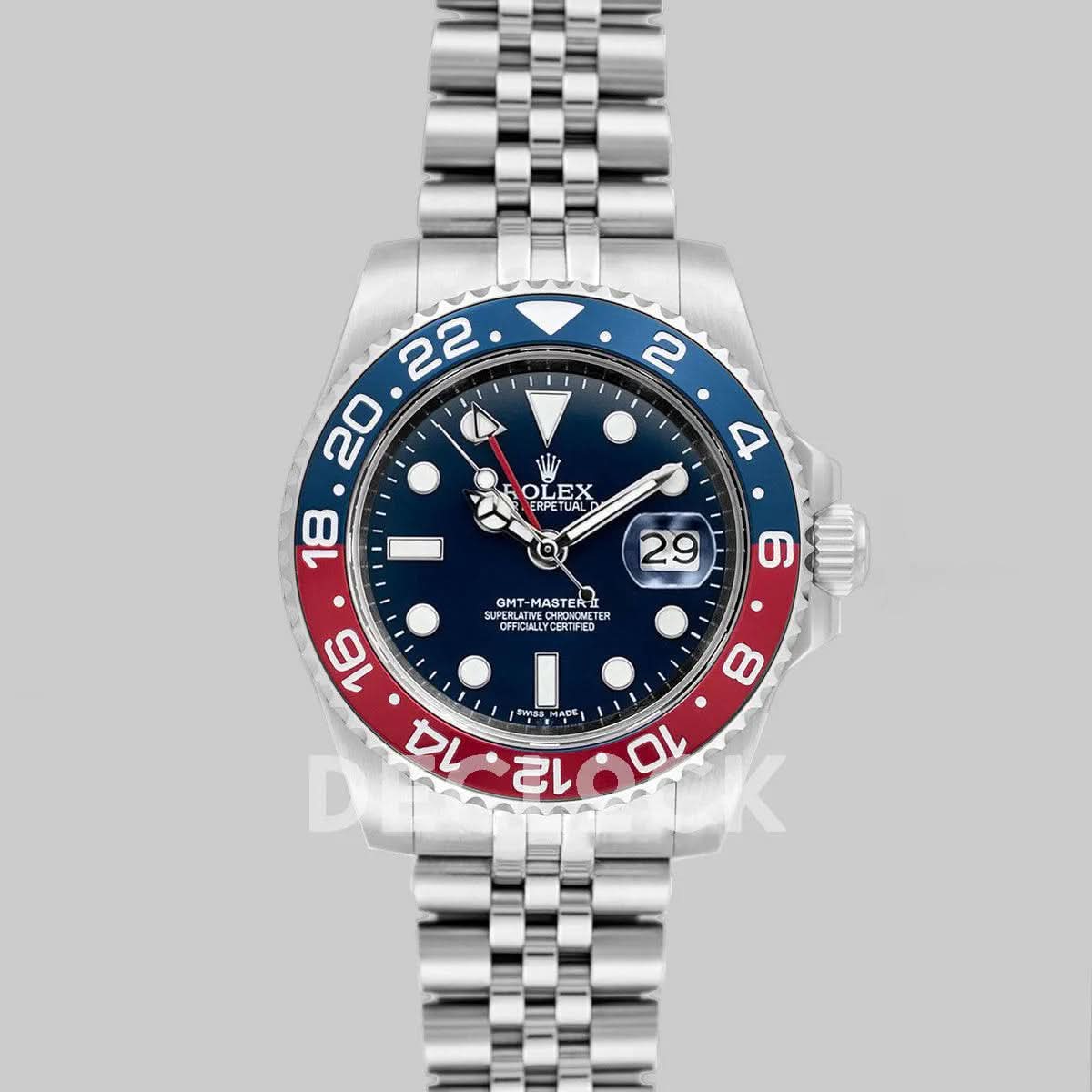 Αντιγραφή ποιότητας του τελευταίου 126710 BLRO black dial "Pepsi" Rolex GMT Master II σε ατσάλινη κάσα και jubilee μπρασελέ.