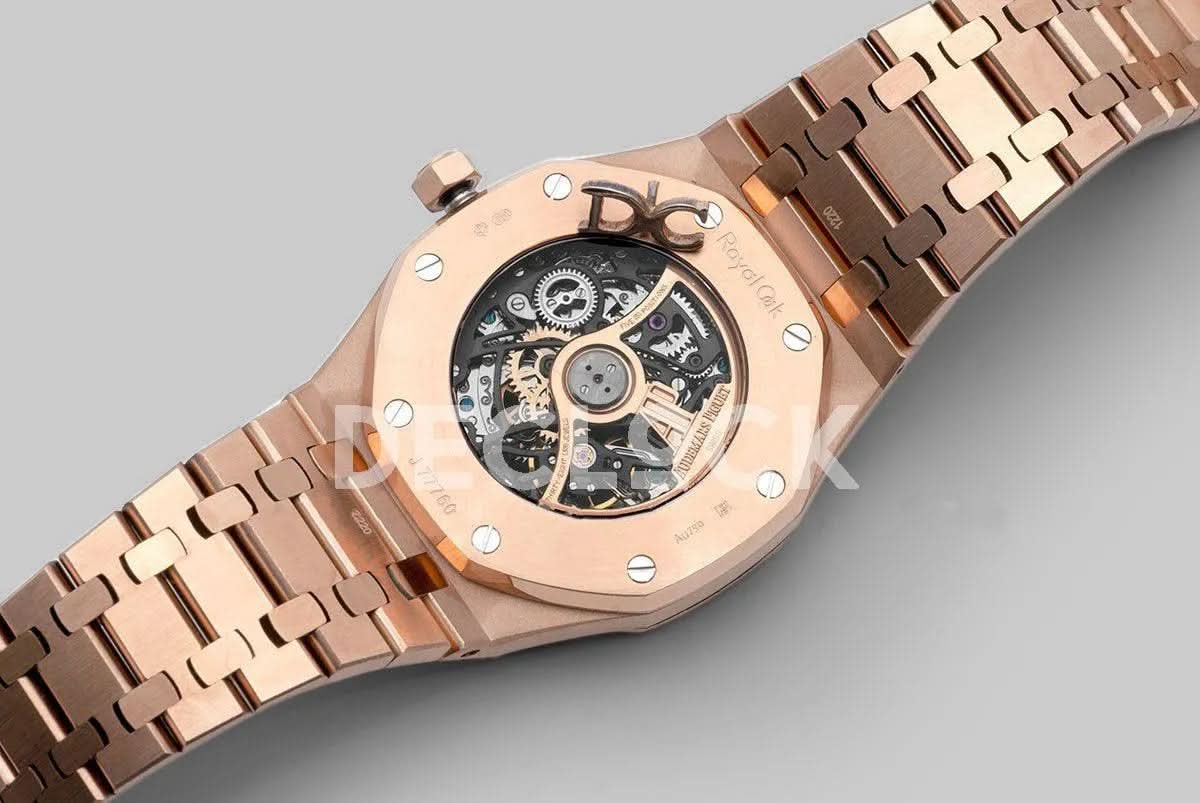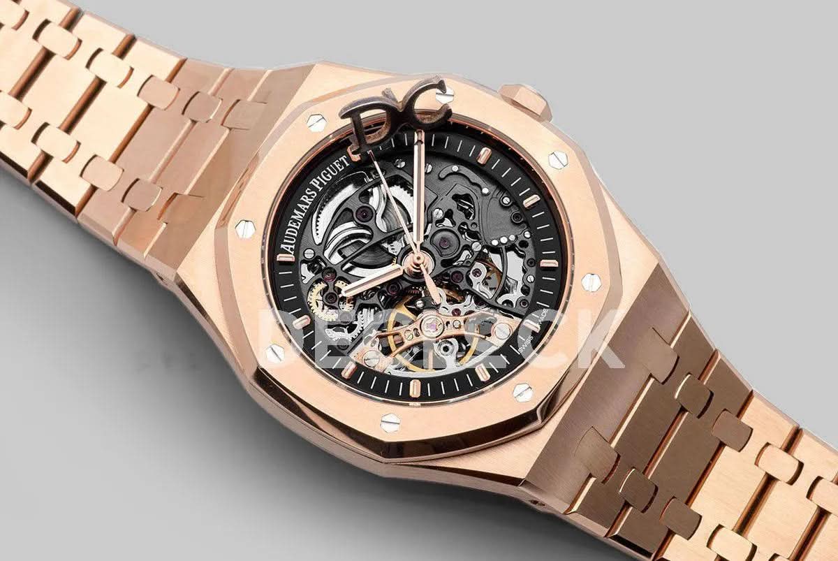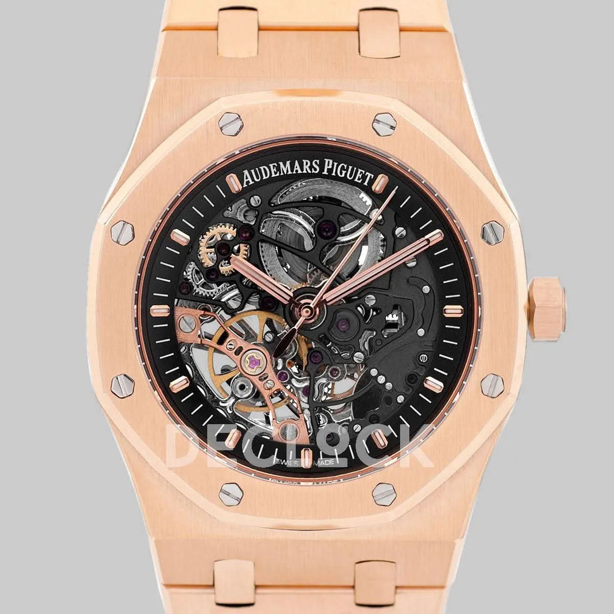 Κάσα | 18k Rose Gold σε ανοξείδωτο ατσάλι 316L, επιπλατινωμένη πλάκα κίνησης (open back) και ρότορας που κατασκευάζονται σύμφωνα με την αυθεντική κίνηση, τον πιο όμορφο AP Cliber 3120 |