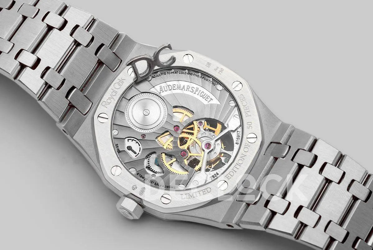 Κάσα | Ανοξείδωτο ατσάλι 316L, με επιπλατινωμένη πλάκα κίνησης (open back) και ρότορας που κατασκευάζονται σύμφωνα με την αυθεντική κίνηση, τον πιο όμορφο AP Cliber 3120 |